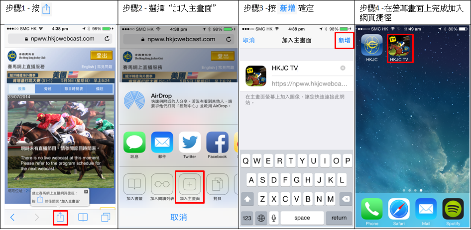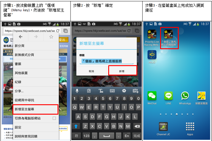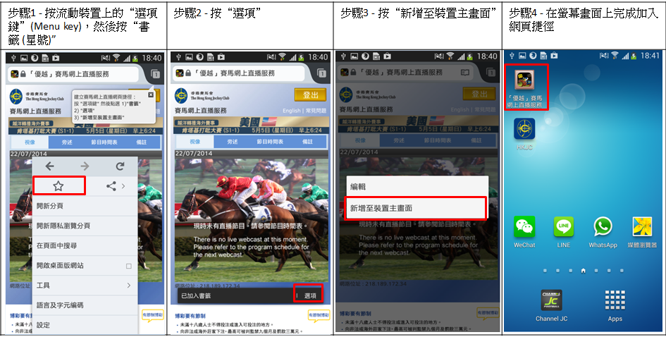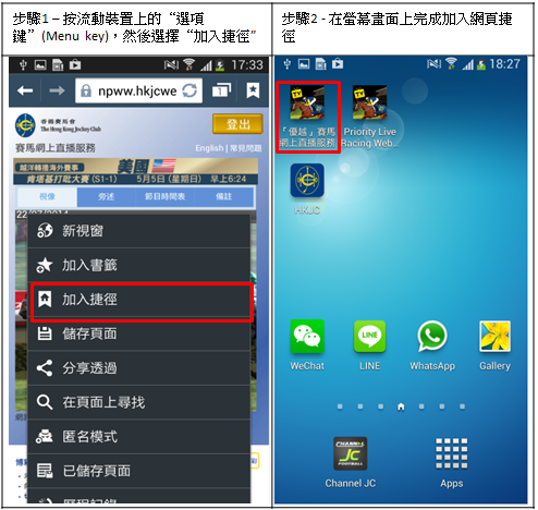 - 如何經Android/iOS App流動裝置登入「優越」賽馬網上直播服務網站hkjcwebcast.com建立網頁捷徑? 建立網頁捷徑步驟: