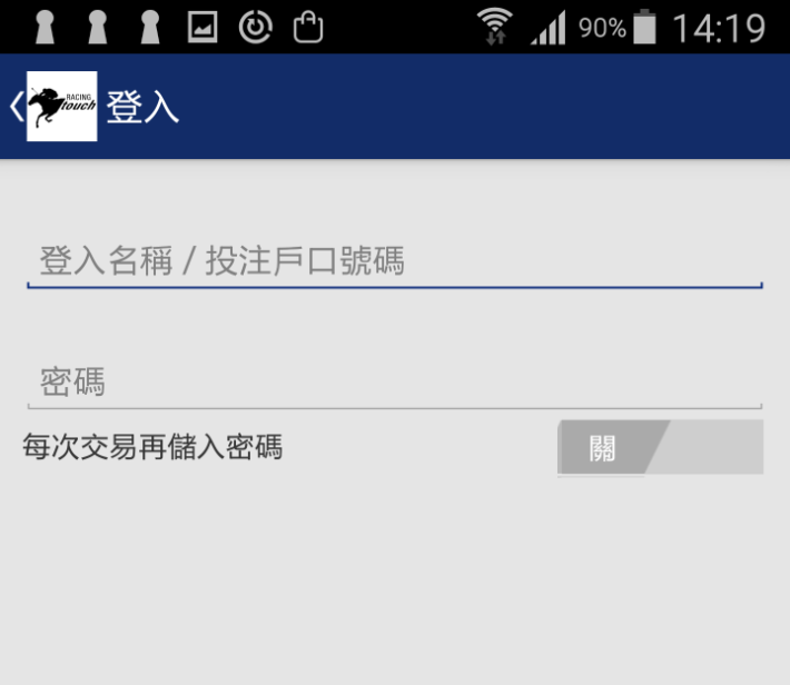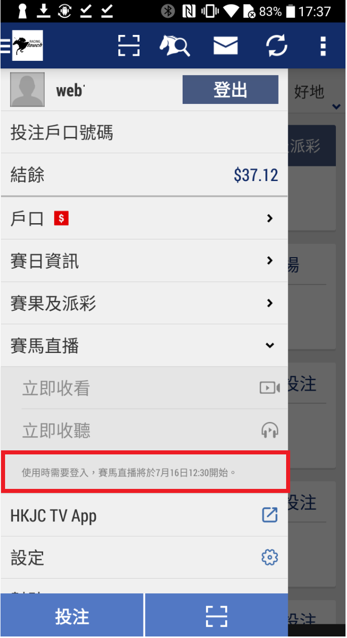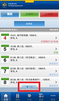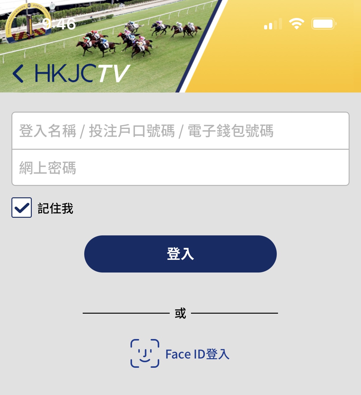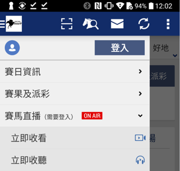 - 經馬會投注三合一 (Android/iOS App) ,流動電視頻道 (HKJC TV App) 或Racing Touch (Android/iPad App) 登入