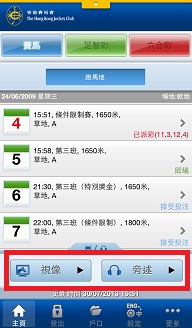3. 於賽事進行期間按左上角的賽馬圖示,然後於賽馬直播下按「立即收看」或「立即收聽」