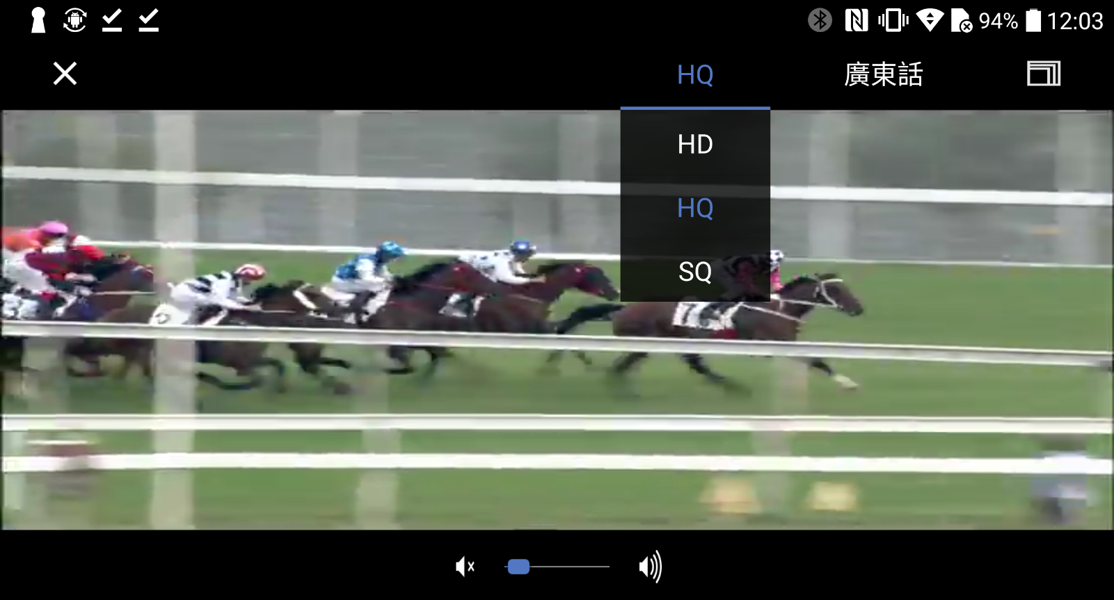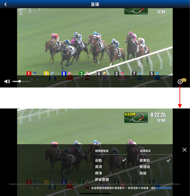 4. 播放將自動開始;於視像直播畫面可按「<」切換至投注版面,另可於直播器內的設定頁面選按「節省數據」、「標準」、「高清」視像