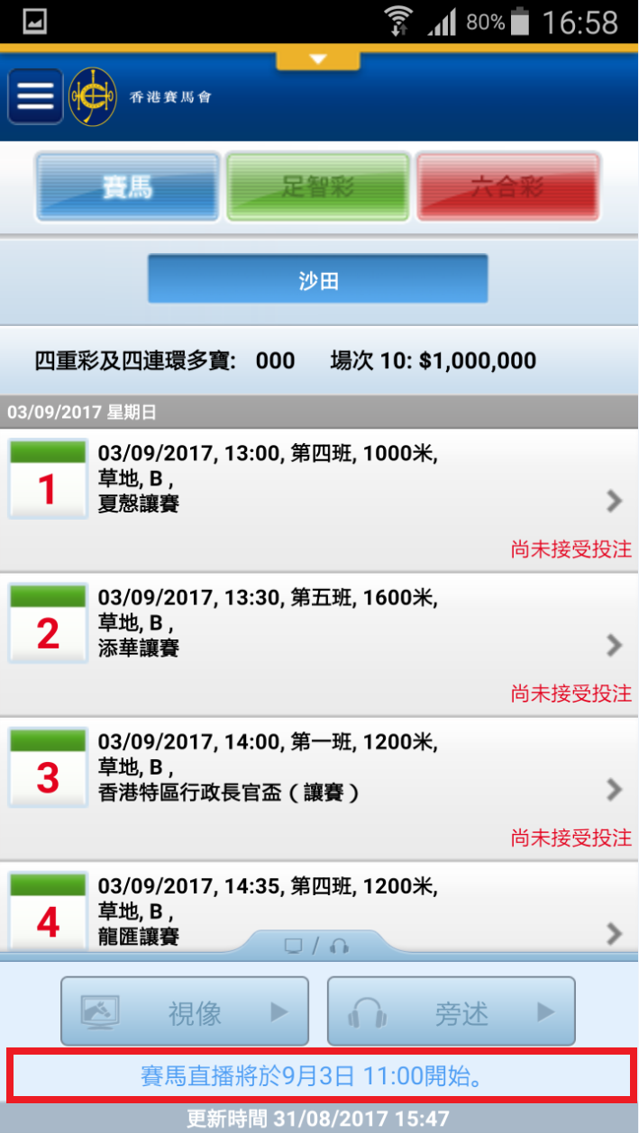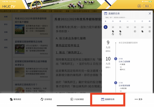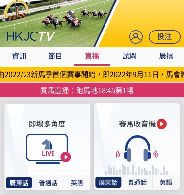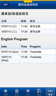 - 如何得知馬會投注三合一 (Android/iOS App), 流動電視頻道 (HKJC TV App), Racing Touch 賽馬直播節目播放時間?