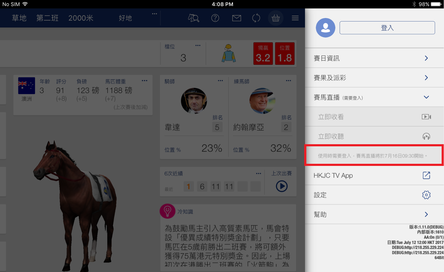 賽馬直播功能只適用於1.22.3或以上版本之iOS App/ 1.18.1或以上版本之Android App。請先把你的投注軟件升級,然後登入,便可見到有關按鈕。